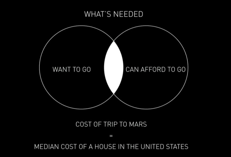 In future, a Mars trip will cost the same as buying a house. Sharing his vision, Musk said that it should be equal to the median cost of a home in the US, i.e., around $200,000. Looking at the current scenario, it could cost something closer to $10 billion per person. Musk expects that transporting 100-200 people at once will reduce the cost of the trip. As more number of trips are taking and technology advances, the cost-per-person will drop significantly.