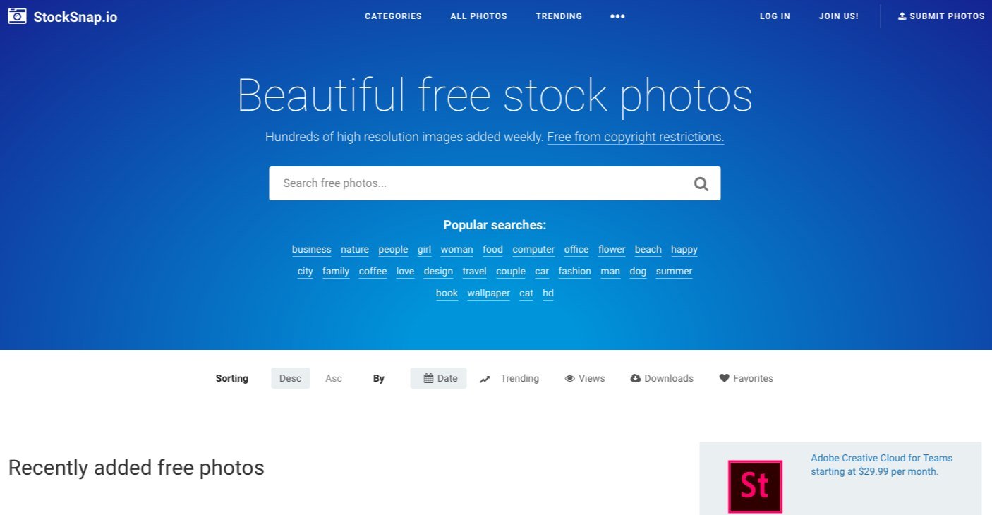 If you need some beautiful and free stock images for social media, StockSnap is your go-to place. It offers high-resolution photos under Creative Commons and does not require any credits for the content. You can explore the photographs by setting filters for date, number of views, downloads, or by checking out the trending section.