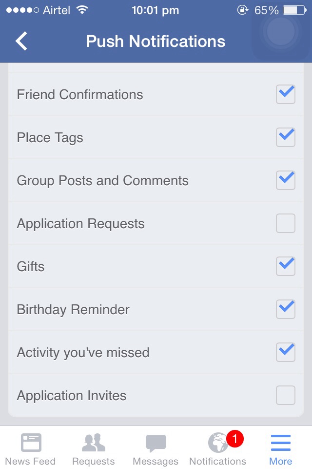 For iPhone : Open the Facebook Application. Go to ‘More’ and then click on ‘Account Settings’. Under ‘Notifications’ click on ‘Mobile Push’ and there simply Uncheck – ‘Application Requests’ and ‘Application Invites’.