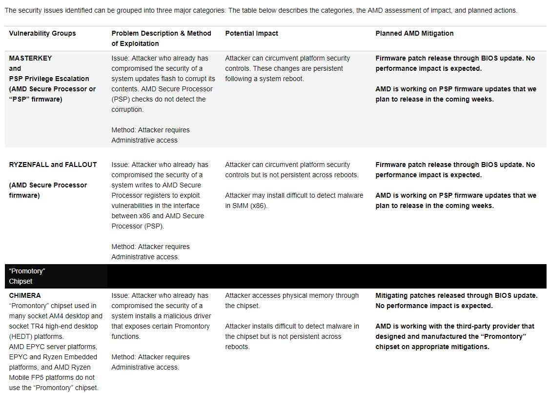 “These issues are associated with the firmware managing the embedded security control processor in some of our products (AMD Secure Processor) and the chipset used in some socket AM4 and socket TR4 desktop platforms supporting AMD processors,” the blog post states.