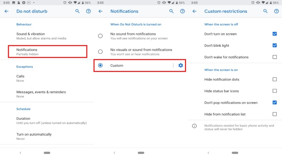To access the block disturbances settings, you can either press and hold DND toggle or go through the Android settings. Then tap on Notifications under the Behaviour tab. You would see a whole bunch of additions under the custom settings like disable blink light, and “wake up for notifications” while the screen is off.