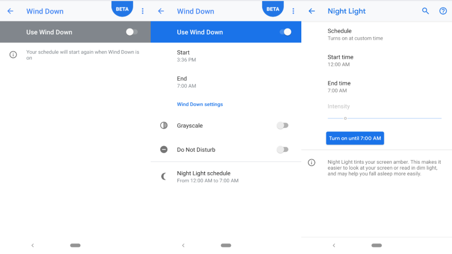- If you want to have good night’s sleep, use the new Wind Down option which turns Night Mode (Reduces Blue light) and Do-Not-Disturb, fading the screen to grayscale before bedtime.