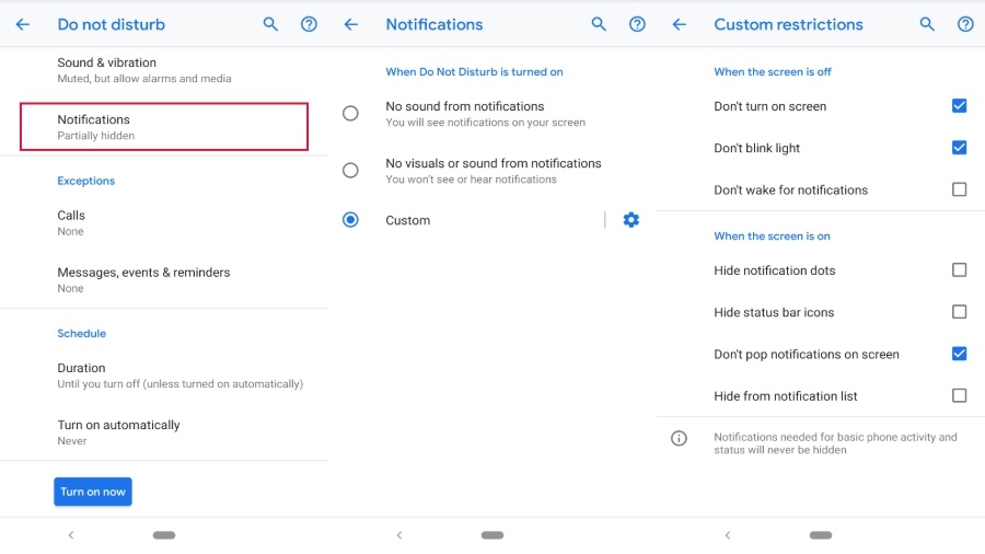 - Then we have the new Do-Not-Disturb which now restricts visual interruptions as well. Now, you won’t see notifications on the screen.