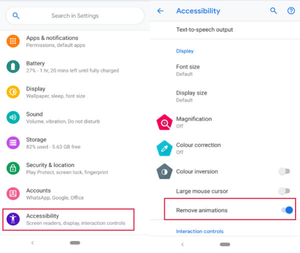 To use this function, go to Android Settings → Accessibility → Toggle the “Remove animations” button.