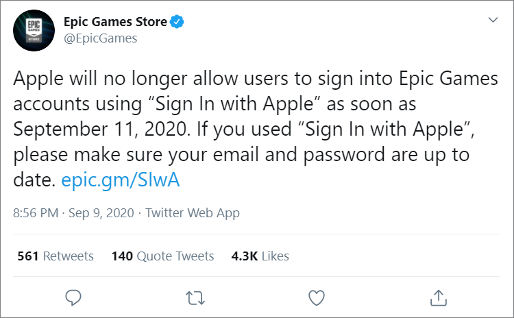 Recently, Epic Games announced that the users will be unable to sign in using the “Sign in with Apple” option from Sept 11, 2020 . That’s the reason why players who are using their Apple ID to sign in to Epic Games need to update their details to retain access.