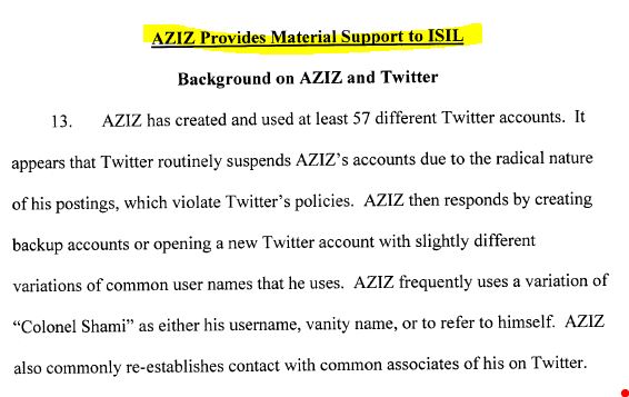 Due to the radical nature of his Tweets, as soon as Twitter closed one account, Aziz opened a new one or created backup accounts. The Twitter handles were a different variation of some common usernames he preferred. Using Twitter, Aziz also established contact with common ISIS-associates.