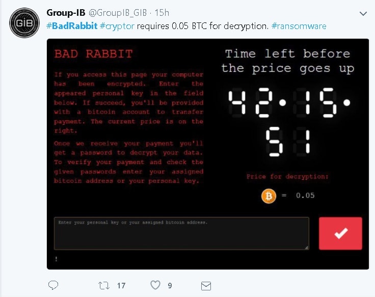 A tweet by Group-IB shows a countdown timer displayed along with the message on-screen. Victims have around 40 hours to make payment, and once the timer overflows, the ransom will increase.