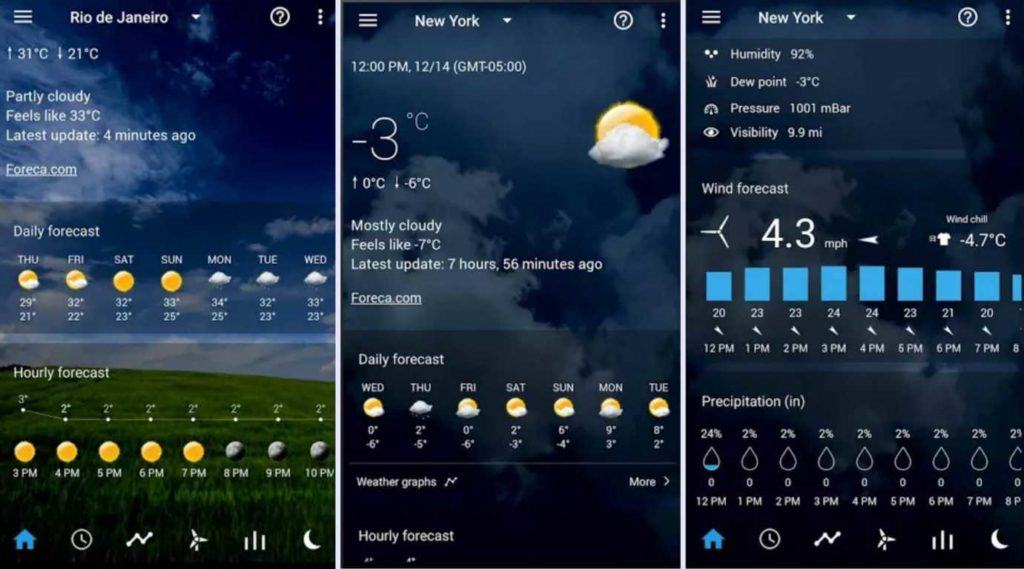 GO Weather is another recommended weather widget that is highly-accurate with its weather predictions. It is known for its simplicity and covers meteorological data for over 100,000 locations around the world. It can automatically recognize your city and set it as default. There is also an option to choose many areas and store them in a list of favorites. Other features include hourly and daily forecast, weather alerts, precipitation forecast, weather map and radar, weather and clock widgets, etc. It has an elegant layout and lots of other info.