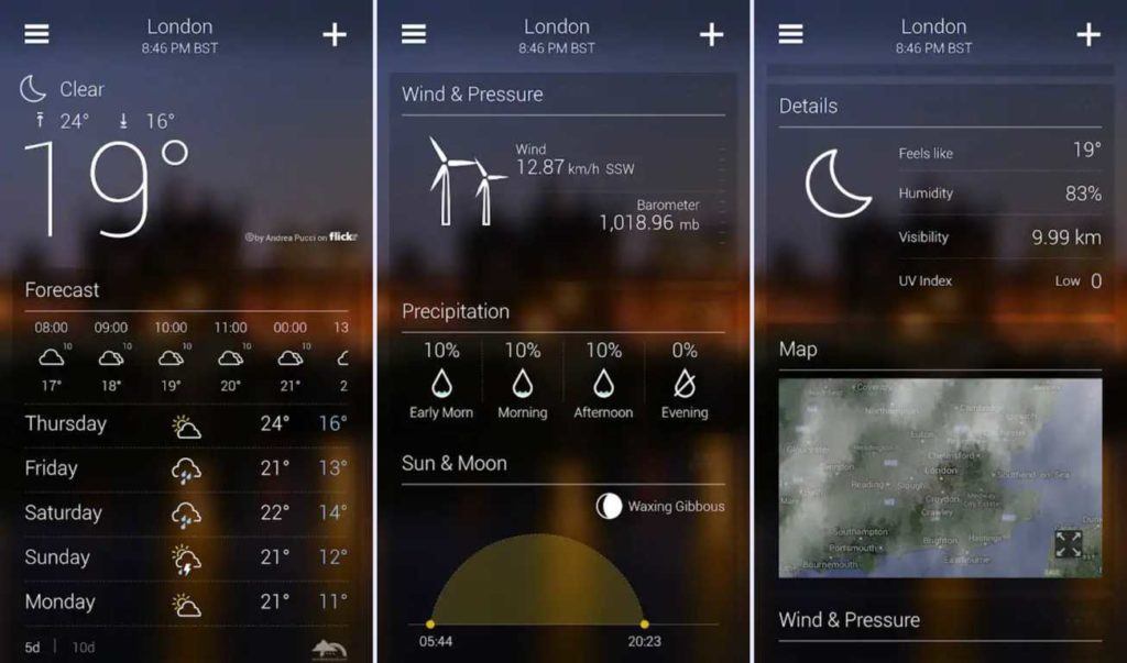 The app is very visual and intuitive. It presents hourly, 5-day and 10-day forecasts, and there is weather alerts, radar information, home screen widgets, humidity sensor, UV index, and precipitation. You can also see sunrise and sunset timings, and the wind and pressure of your location.