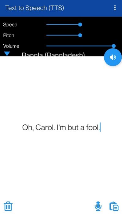 This app from TK Solution is a quite decent pick when it comes to converting text to speech. You can type or paste a text in the app and have it read aloud as per custom speed, pitch, and volume preferences.