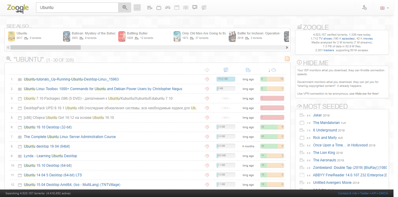 The mirror domain carries basically the same user interface and layout of options. You can find the torrent catalog, most popular torrents, and Top torrents section at the top. These are complemented by a tag cloud that tells you about the common searches on the website.