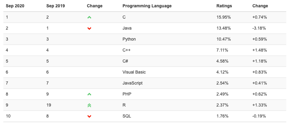 Meanwhile, Java’s popularity has been declining since September 2019, with the most significant drop of 3.18% observed in this month’s index. Despite that, Java remains in second place, behind C, but ahead of Python, C++, C#, Visual Basic, JavaScript, PHP, R, and SQL.