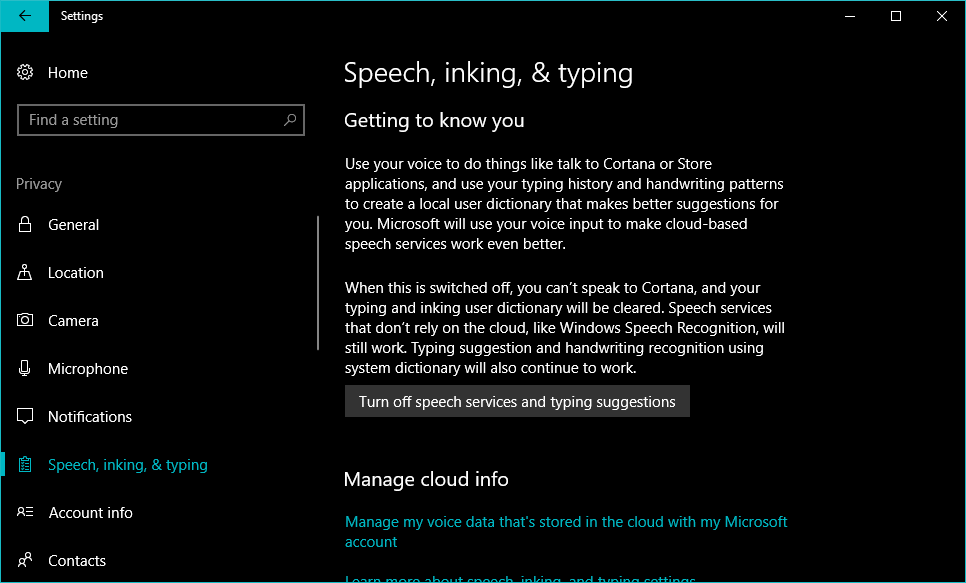 For your Voice history, you can visit Settings > Privacy > Speech, inking, & typing . There, enable the toggle button that says Turn off speech services and typing suggestions .