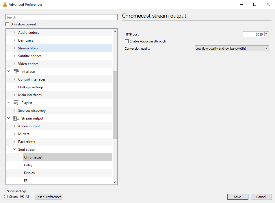 The conversion process may increase the loading time of the video on your TV screen. Go to Tools > Preferences . Select the All radio button at the bottom of the window. Then under Stream Output , expand Stout Stream . Select Chromecast and change the conversion quality. Hopefully, it might help.