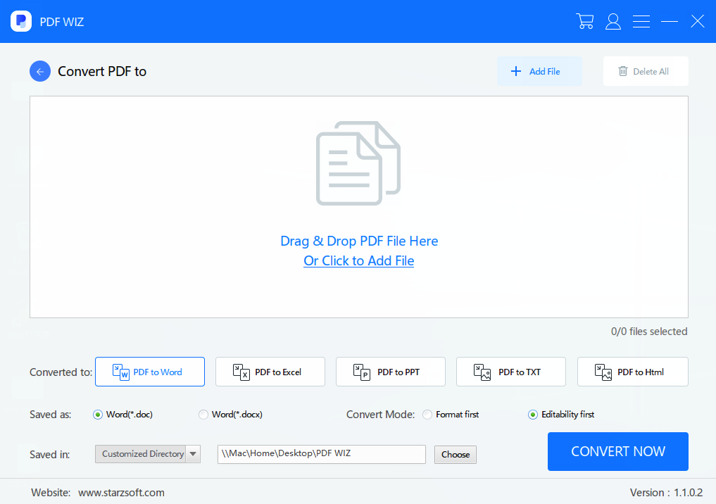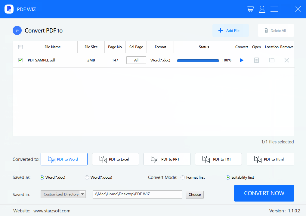 Below this section, you will have the option to convert into Word formats *.doc and *.docx. Other options tell the software to convert the PDF by putting a priority on format first, or edit ability first, so select the one most important to you.