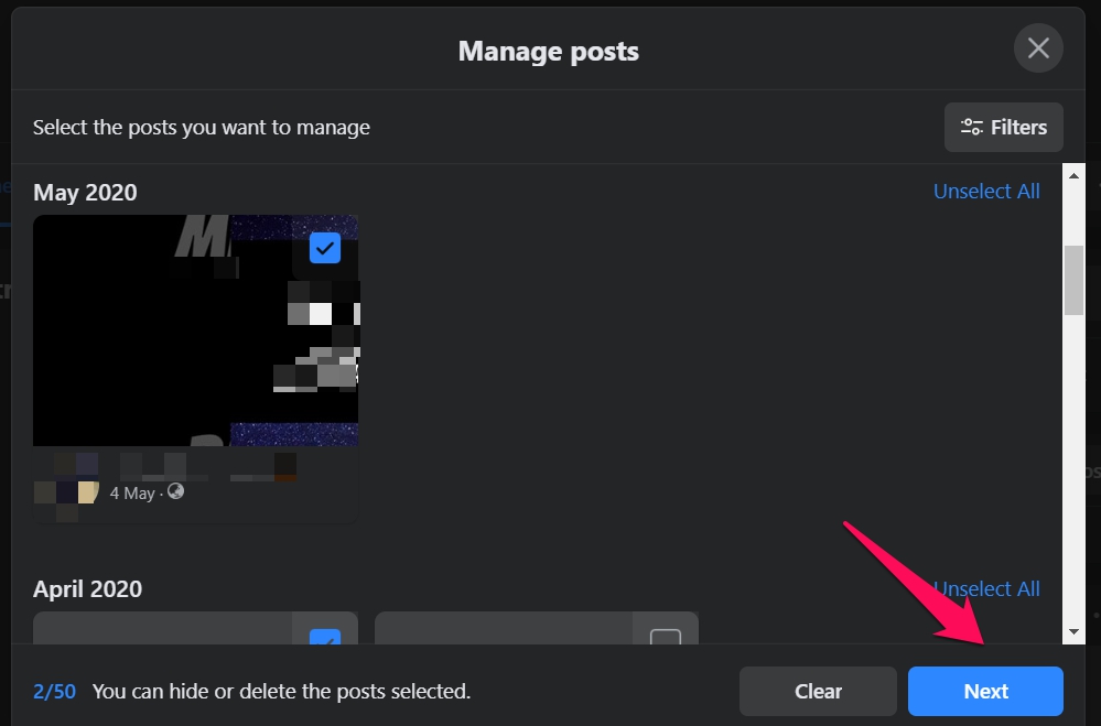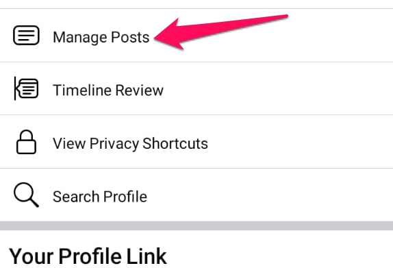 Click on the three-dot button on the right side of the screen. Then click on the Manage posts button next to the Filters button.