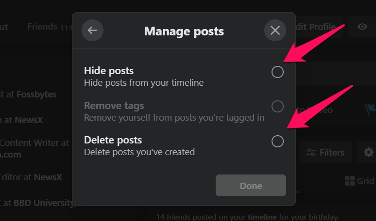 - Click on the Delete posts option to bulk delete your old Facebook posts.