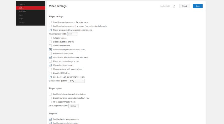 The icon for this add-on appears in the top right corner of the page. You can access its options after clicking that icon. To change video quality and autoplay options, click Video in the left pane.