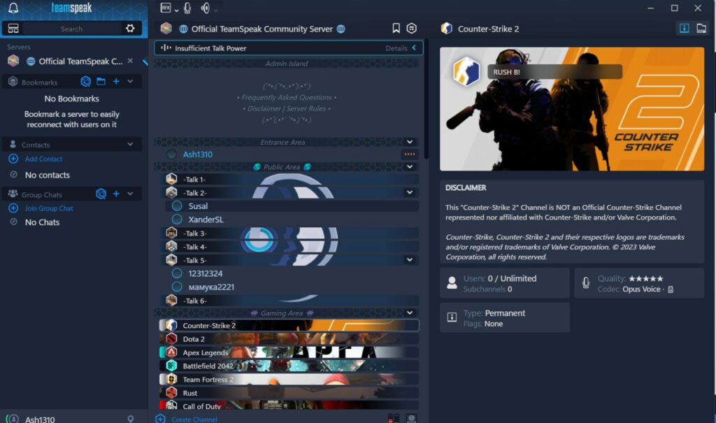 To get things started, TeamSpeak enables users to create their servers and extend invitations to others. Moreover, the platform utilizes the Opus codec for low-latency voice communication, ensuring conversation quality comparable to Discord.