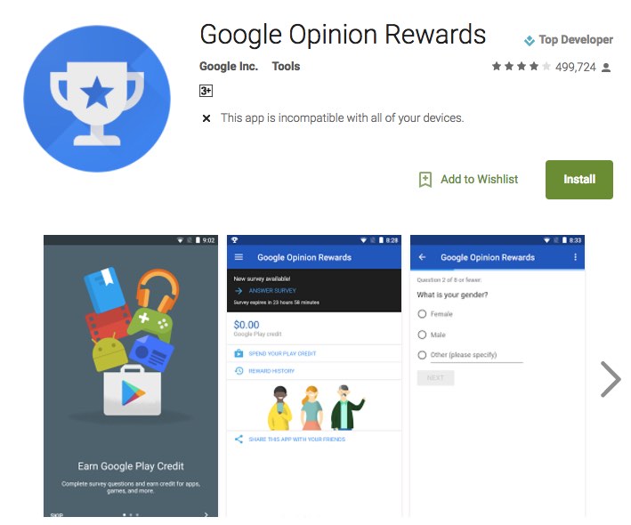 Google Opinions Rewards app is a well-known method of grabbing free Play Store credit. You can use that credit to get paid Android apps and games for free from Play store and avoid spending money. You need to install this app on your Android device and answer some surveys. Please note that you’ll be able to take part in one survey each week. The payout is low but not bad.