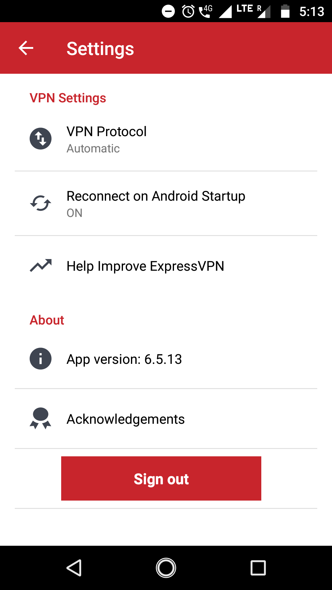 Swipe from the left to reveal the available options in the app. The Settings screen offers a couple of things including the ability to change VPN protocols. Contrary to what I saw on Windows, the ExpressVPN Android app only supports OpenVPN TCP and UDP protocols. If you want to use other VPN protocols, you can setup a VPN connection manually.