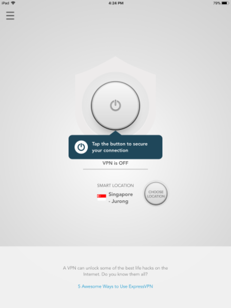 The ExpressVPN iOS app , when used on the iPad, looks like a blown-up version of its iPhone and Android siblings. You can see the same Connect button, smart location suggestion, and the option to choose location manually.