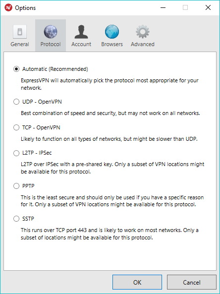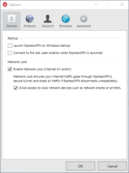 The Options window opens the door to access the few settings available for Express VPN. Under the General tab, you can choose whether ExpressVPN should start automatically when Windows boots, connect to the last used location, etc. Support for Kill Switch is also available in the ExpressVPN app.