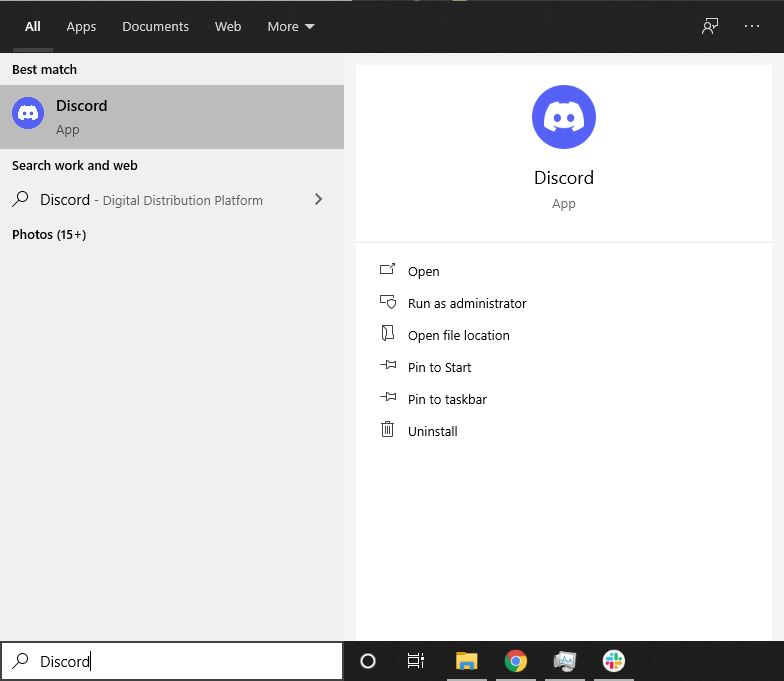 1. Search Discord in the search menu and select Uninstall in the side menu.
