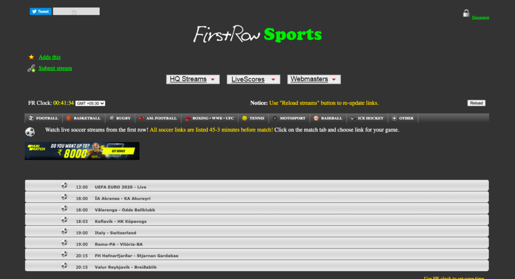 First Row Sports is another sports streaming website that has proved its mettle lately. Here, you can find links to watch live sports events including football, basketball, rugby, boxing, tennis, motorsport, baseball, ice hockey and more. The website is fairly new but they have been working hard to gather more sports streaming links for their websites. First Row Sports features advertisements but given its free of costs services, it is justified.