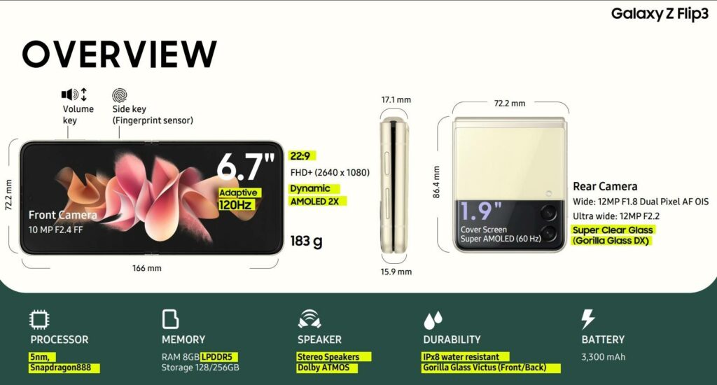 The biggest visual change in Galaxy Flip3 is the front design and the processor. Samsung has gone ahead and equipped the Samsung Galaxy Z Flip3 with Snapdragon 888, Qualcomm’s second most powerful mobile CPU.