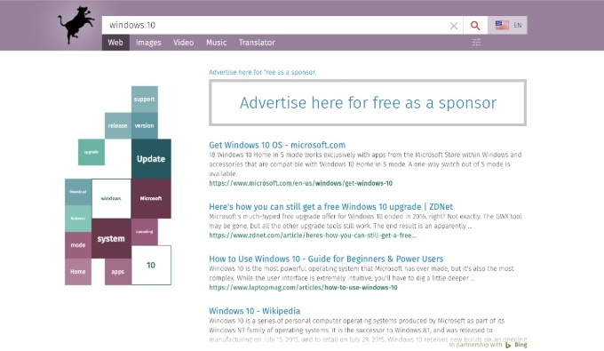 Swisscows has its own ad system where ads are solely targeted based on your query and not even your location. Another reason why I love Swisscows is the grid of suggestion tags it offers whenever you type in a query. For example, typing Windows 10 suggests other words, like laptop, install, apps, update, features, etc.
