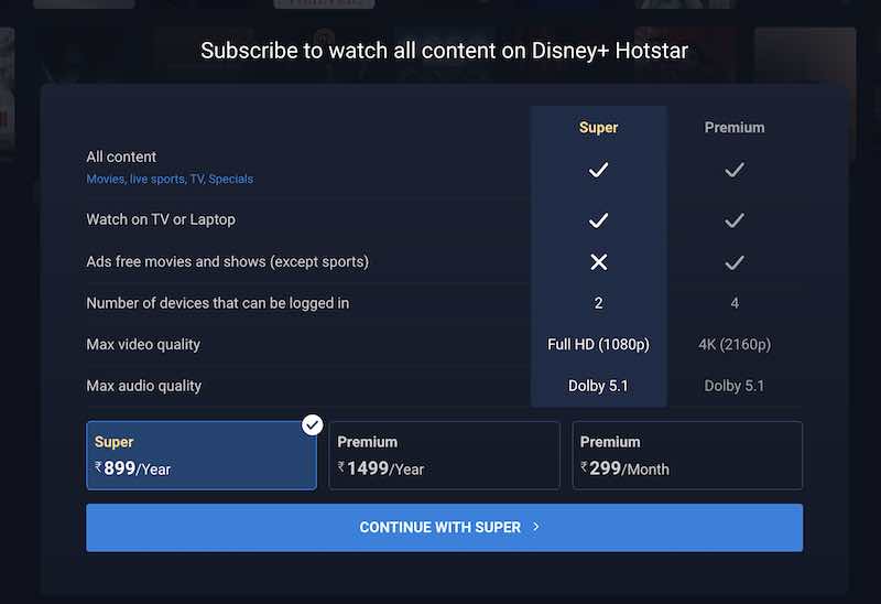 Disney+ Hotstar doesn’t offer a trial of any sort, but three paid plans to choose from – VIP, monthly premium, and yearly premium. Here’s what every plan has to offer. The best one is the Rs. 1499 plan, which is a great value for money plan if you’re a lot into movie and TV shows streaming