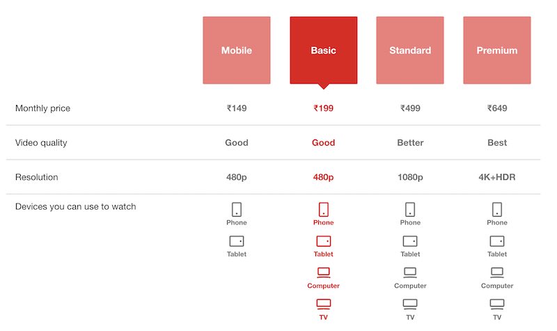 The plans are Mobile, Basic, Standard, and Premium, cost Rs. 149, 199, 499 and 649. The quality in the 149 and 199 plans maxes out at 480p, whereas the 499 provides content in 1080p and 649 in 4K+HDR. Here’s everything these plans offer.