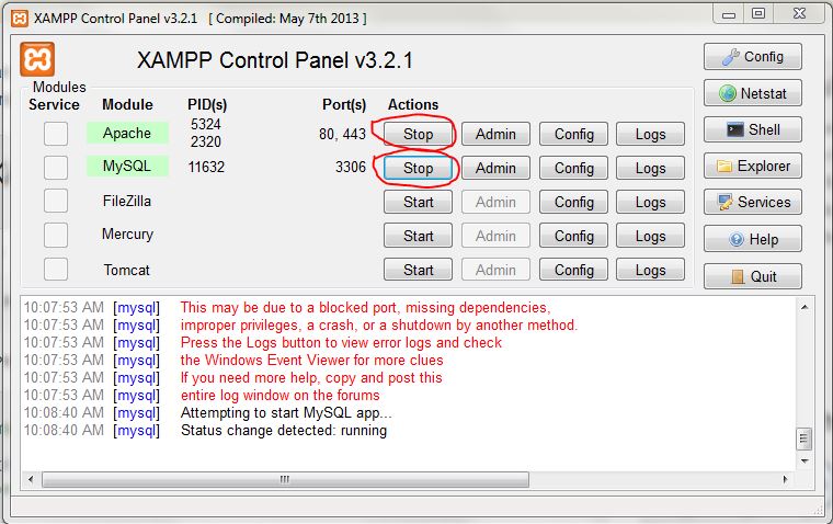 - Open XAMPP control panel from start menu and enable Apache and MySql services.