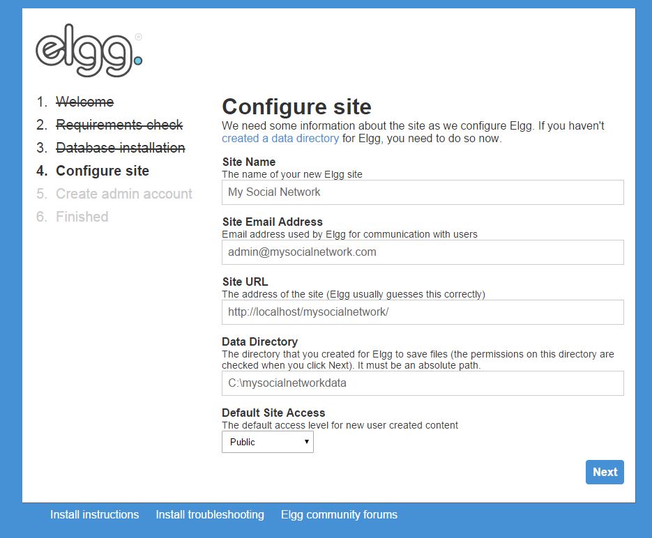In this step give your social networking website a Name. If you have a mail server on your local you can give some mail address for now just give [email protected] . For the data directory, create a directory to store your social networking data and give the absolute path here. e.g.we created mysocialnetworkdata in c:\