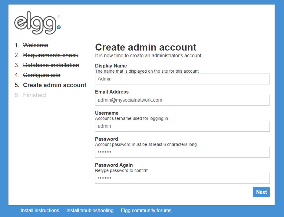 You will need a master admin account to manage your website. With this account you can control your social networking website, it’s users and contents. Create an admin account and click next –