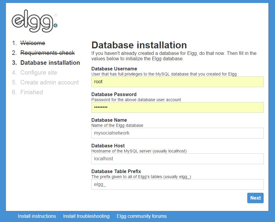 In database installation step of the Elgg installation wizard fill up the required fields and click next –