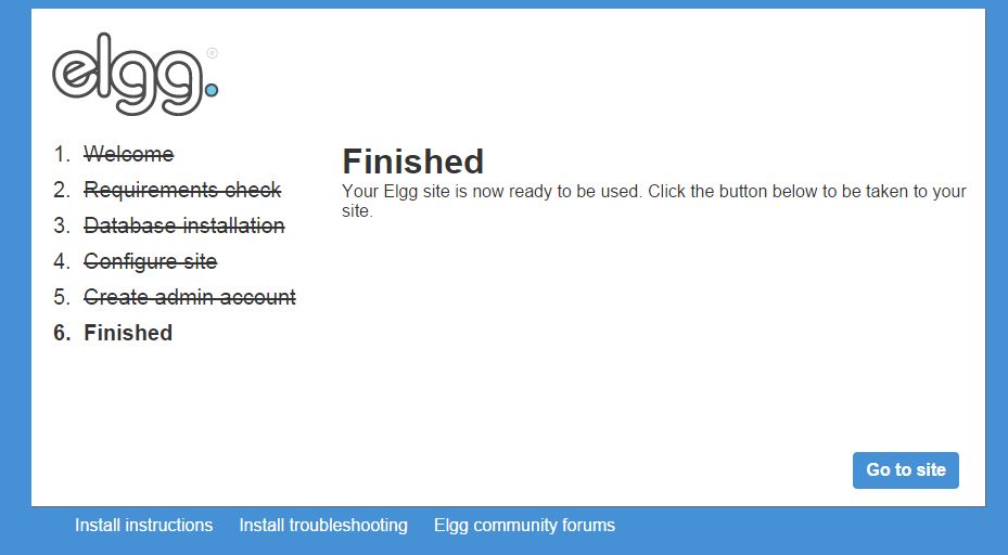 You have your own social network website up and running. Now you can use the administration panel to make this site as you want. You can change the look and feel, functionality, add plugins for more features and much more. Admin panel can be accessed at https://localhost/mysocialnetwork/admin with the credentials you have created while installing Elgg.