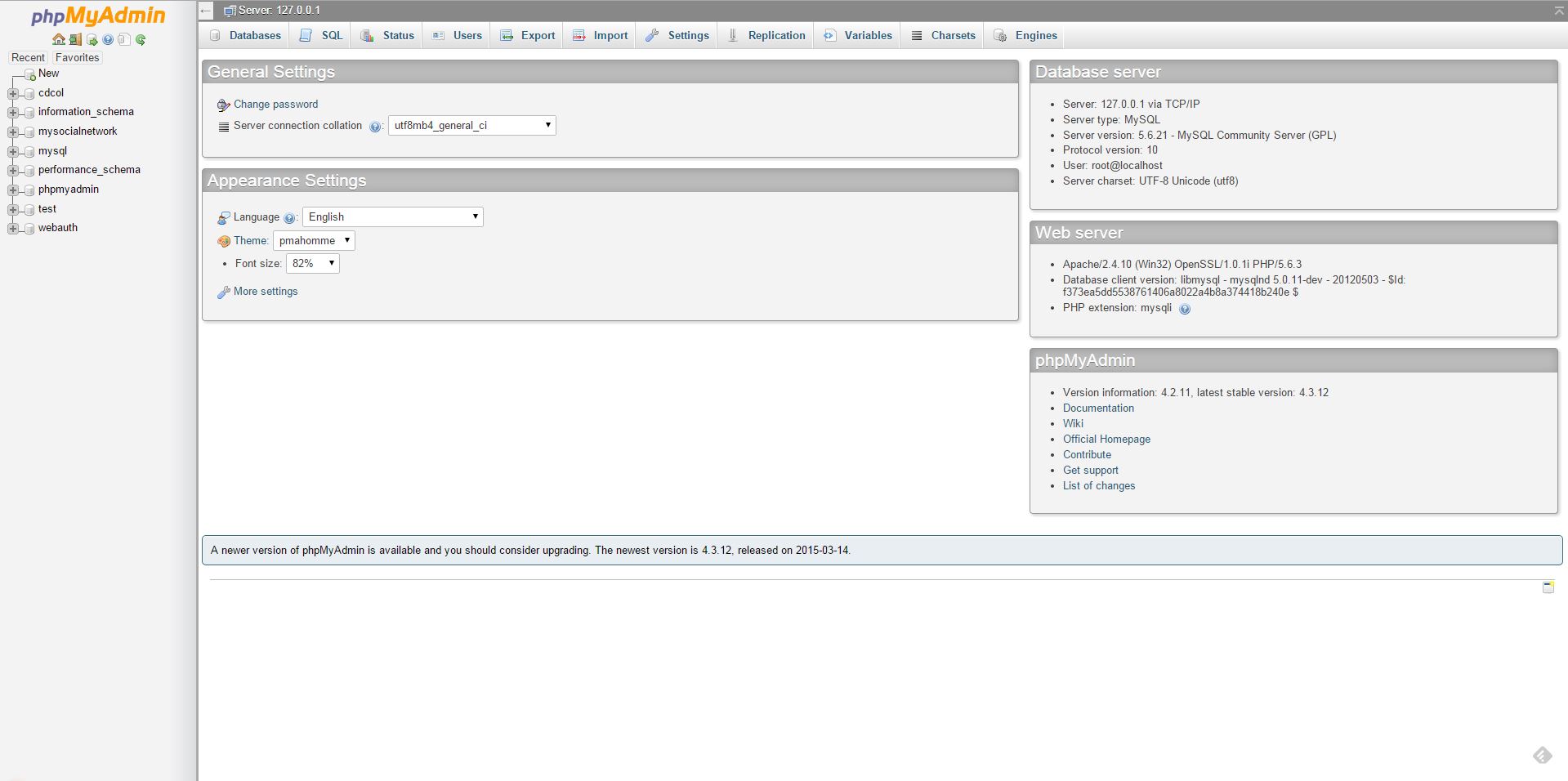 We already setup password for our database root user. We will now use these settings but before that go back to your XAMPP admin panel and click on the phpMyAdmin link on the left sidebar under Tools section. phpMyAdmin is web-based front-end for our MySQL database. Login to phpMyAdmin using root user and your password, it will open following page where we can manage your databases –