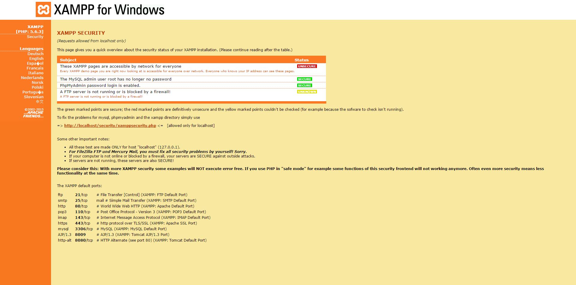 There is one important thing we should never forget to do is to check the security settings. Click on the security link on the left sidebar of the admin panel. You will see that MySQL has root user but no password and hence showing insecure –