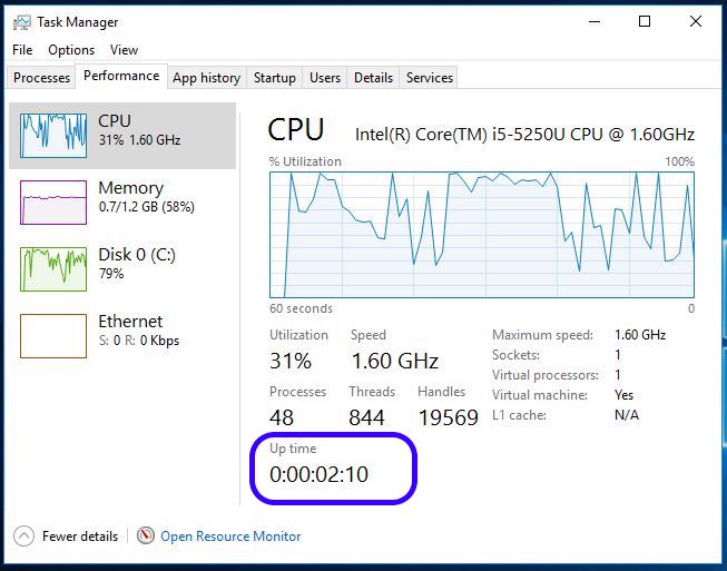 There, under the CPU tab, you’ll find the uptime stat of your Windows PC in the Days:HH:MM:SS format.