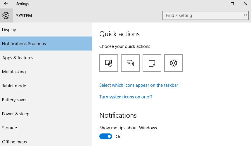 - Go to Start menu > Settings app and then open System > Notifications & Actions. Deselect the option “Show me tips about Windows” and reboot the computer.