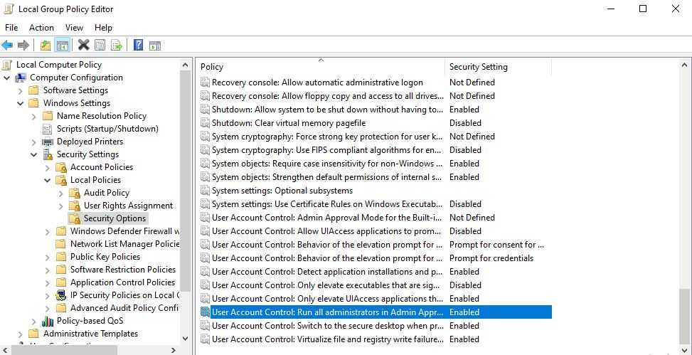 3. Scroll down to the list on the right and double-click on “User Account Control: Run all Administrators in Admin Approval Mode.”