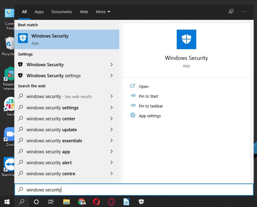- Click on the Search button in taskbar, enter “Windows Security,” and open the same.