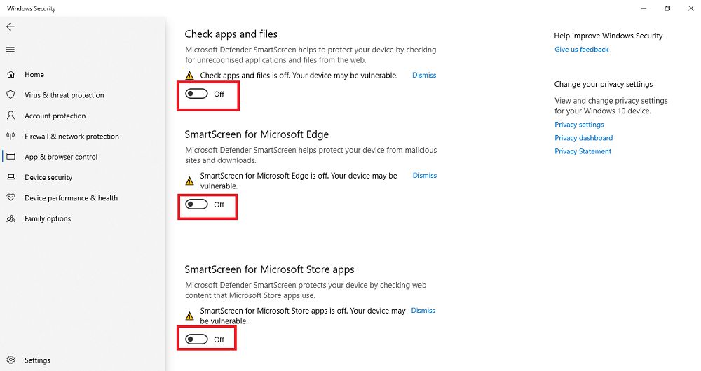 4. Toggle off “Check apps and files,” “SmartScreen for Microsoft Edge,” and “SmartScreen for Microsoft Store Apps.”