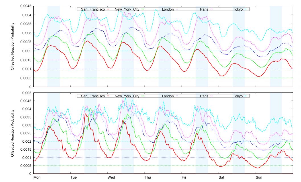 The graph shows the likelihood of your posts getting viral on Facebook (top) and Twitter (bottom) during different times of the day and week. Here San Francisco is depicted by red, New York by dotted green, London is dotted blue, Paris is the dotted purple one and Tokyo is shown by a dotted aqua line.