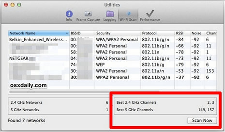 Simply Hold the Option key & Click the Wi-Fi icon on the menu bar->Select Open Wireless Diagnostics-> Click the Windows Menu->Select Open Wireless Diagnostics->Click the Window Menu-> Select Utilities-> Select the Wi-Fi Scan Tab & Click Scan Now. The “Best 2.4 GHz Channels” and “Best 5 GHz” Channels” fields will automatically recommend the ideal Wi-Fi channel one should be using on their router and increase Wi-Fi speed.