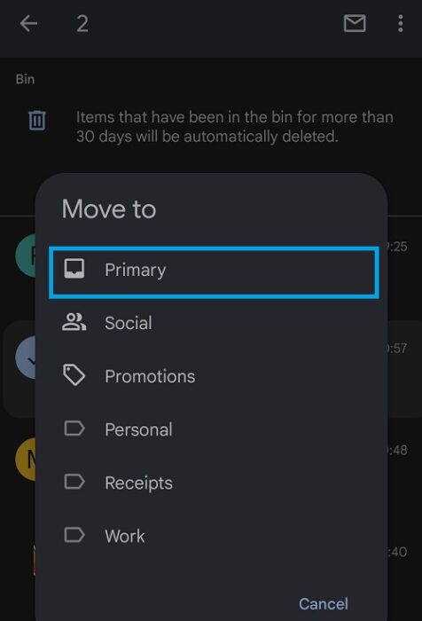 6. Tap on the desired destination for the recovered email. In this demo, I’m selecting “Primary” to send the email back to my inbox.
