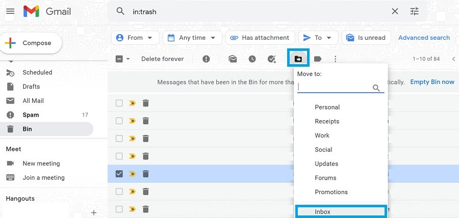 5. Click on the “Move to” button and select where you want to restore the deleted email. In this example, I’m selecting the “inbox” as the destination.