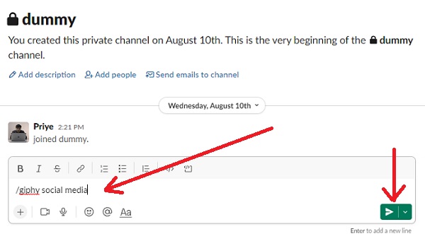 - Select any Slack conversation and enter “/giphy” followed by any keyword, for instance, “/giphy social media” (without parentheses). Next, hit Enter or click on the send button. (Don’t worry it won’t send anything yet but only show you a preview)